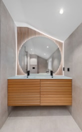 Med samme uttrykk på begge bad fikk kunden en harmoni og helhet i design, samtidig som baderomspakkene ble tilpasset å dekke ulike praktiske behov og rommenes størrelse. Den nordiske stilen kjennetegnes mye av å integrere naturmaterialer i detaljene, og her ble spiler i flott eik en stor del av designet.